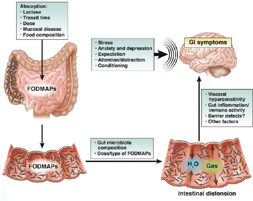 셋째, 포드맵은 대장에 살고 있는 장내세균에게는 매우 이용하기 좋은 물질로 장내세균의 발효작용이 증가하고 결과적으로 수소, 메탄, 이산화탄소와 같은 가스가 발생한다.