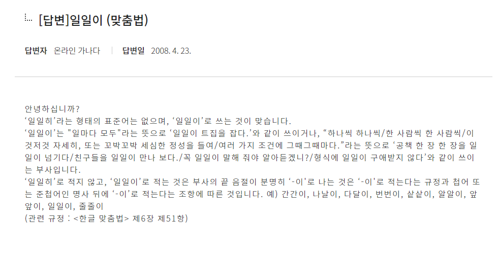 1. "일이리 얘기해줘야 하니?" "일일히 얘기해줘야 하니?" 분명 이와 같은 케이스에서는 전자와 같이 말한다. 즉 일일이는 일이리라고 말을 하기 때문에 발음을 자세히 생각하면 일일히가 아니라 일일이가 오는 것이 당연하다.