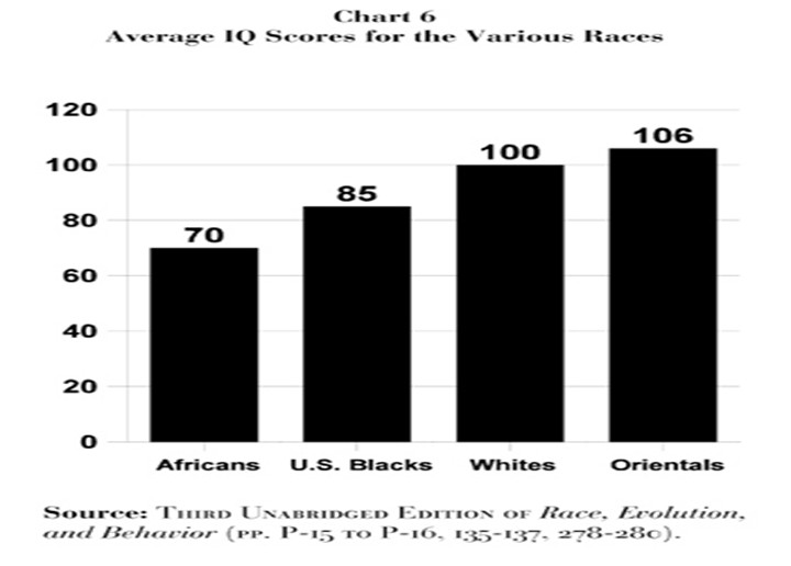 미국내 거주 흑인은 85이고, 미국내 거주하는 동북아시아인은 110정도 되는데 이 수치가 평균이기 때문에 흑인의 경우 70 정도의 흑인도 있고 100이 넘는 흑인들도 많다. 반대로 동북아시아인 역시 100이 안되는 아시아인들도 많다. 평균적으로 아시아인이 아이큐가 높다는 것이지, 모든 아시아인이 흑인보다 머리가 좋은 것은 100% 아니다. 다만 그럴 가능성이 높다는 것 뿐