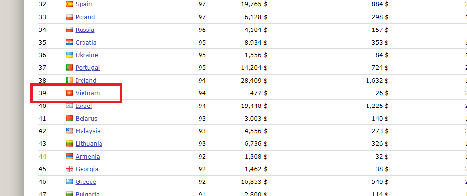 추가적으로 베트남의 높은 순위를 봐야 된다고 말하고 싶다. 물론 동북 아시아 나라들에 비해서 부족하지만, 39위라는 높은 순위를 차지했다. 라이벌 나라라고 할 수 있는 태국같은 경우 순위가 한참 더 낮은 것에 비해서 러시아와 같은 국가와 순위가 비슷하다. 미국이 98이니 미국과 큰차이가 없다고 봐도 무방하다.