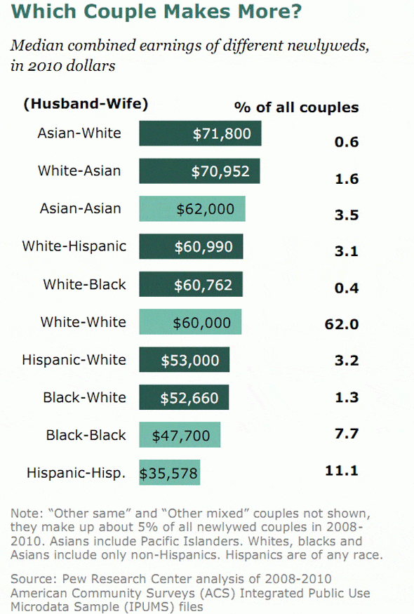 인종에 따라 수입도 다르지만 아이큐와 상당히 유사해진다는 것을 알 수 있다. 위 자료 말고 최근 자료에 따르면 아시아인의 평균 수입은 8만 달러대 백인은 6만 달러대이며 흑인은 4~5만 달러대의 수익이다.