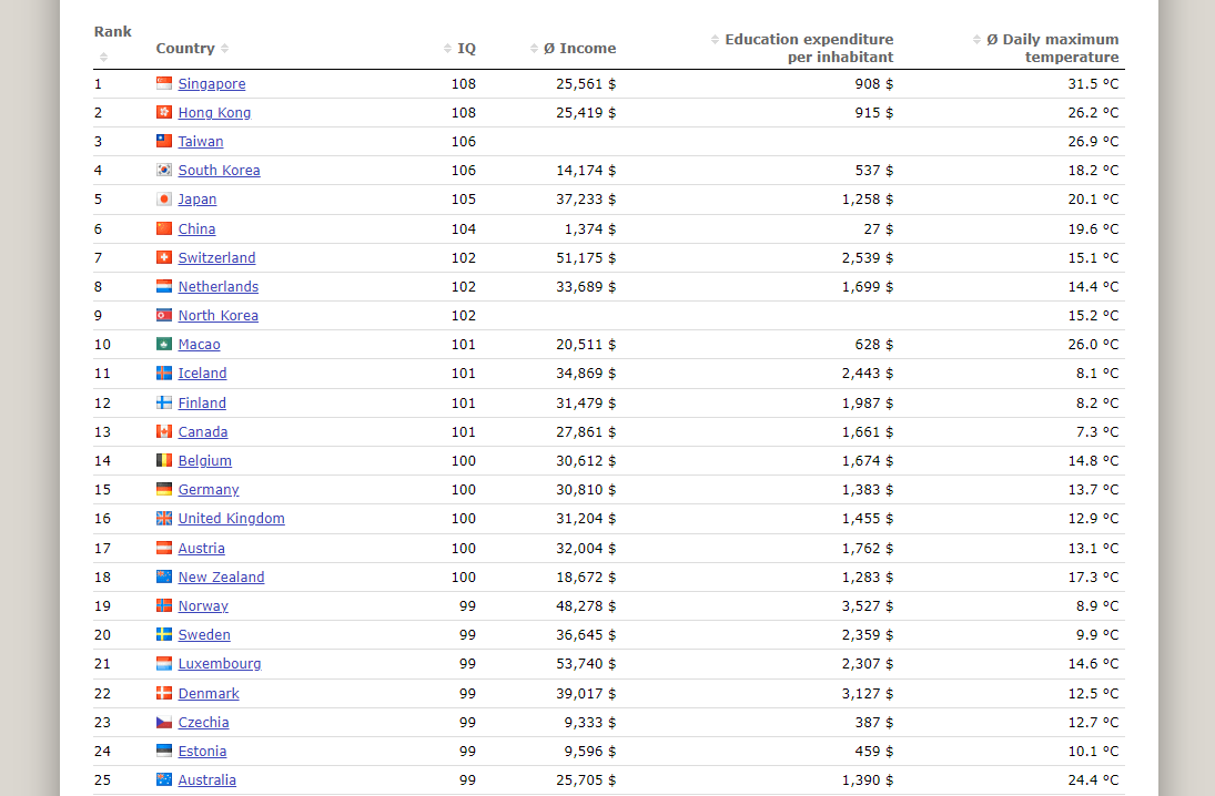 여기에 배움이 상대적으로 떨어질 것 같은 북한도 랭킹이 9위로 상당히 높은 순위를 차지한다. 즉, 순위를 보면 GDP의 순위보다 인종간의 순위가 더욱 강해지는데 북한 같은 경우 모든 외래어를 한글로 바꿔버리는 나라기 때문에 한자가 아이큐에 영향을 준다는 몇가지 가설들은 기각된다.