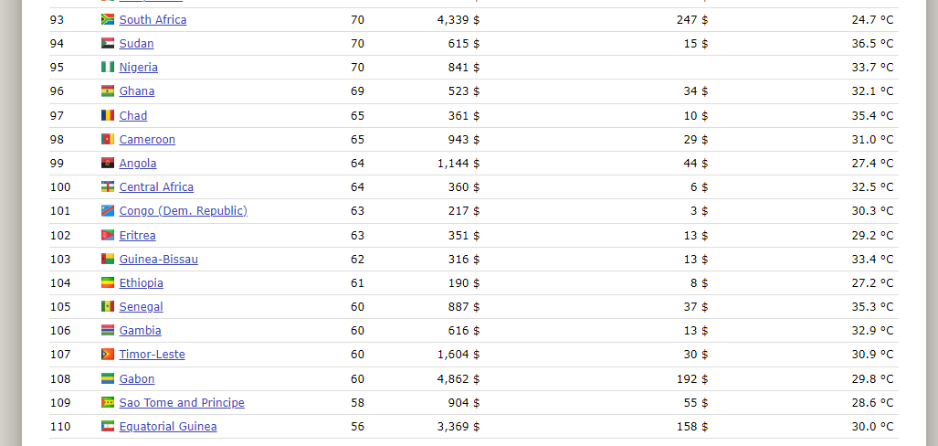 이번에는 아이큐가 낮은 나라를 보면, 대다수가 아프리카들이 포진되어 있다는 것을 볼 수 있다. 아프리카중에 잘 살며 백인들도 많아서 아이큐가 상대적으로 높을 것으로 기대되는 남아프리카마저도 70밖에 안된다. 즉, 아프리카의 경우 70정도만 되어도 상당히 높은 수준의 나라라 생각해도 된다.