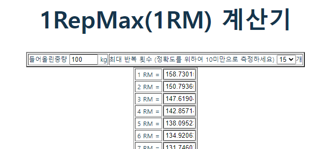 100kg 15회면 1RM 계산기로 할 때 약 160kg을 1RM으로 볼 수 있기 때문에 스쿼트를 1RM으로 160kg 이상은 들 수 있는 것으로 예상할 수 있습니다.
