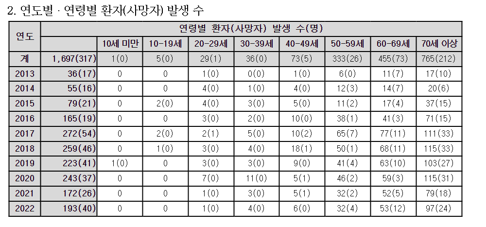 40대부터 사망자가 나오기 시작하며 치명률이 6%가 넘는 비교적 위험한 질병이라 생각할 수 있지만, 사망자수는 40대의 경우 5명으로 2년에 한명 꼴로 죽는 매우 적은 수치의 사망자입니다. 사실 이정도의 사망수는 벼락을 맞고 죽는 수와 비슷할 정도로 40대 이하 분들은 너무 큰 걱정은 안하셔도 될 것 같네요.
