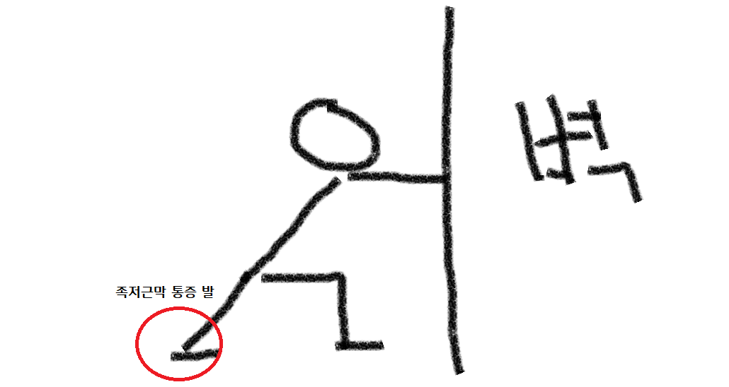 통증이 없는 한쪽 발은 벽에 가까이 대고, 통증이 있는 발을 벽과 멀어지게 한 다음 벽을 미는 방식이 있습니다.