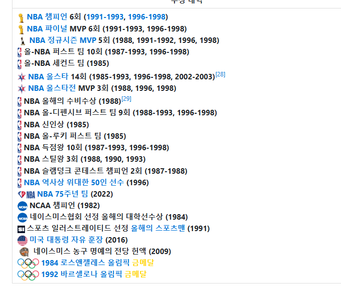 위 자료는 마이클 조던의 수상 기록입니다. 르브론 제임스가 더 위대하다 보는 사람은 그의 토탈 점수등을 보는데요. 마이클 조던의 경우 루키때 올 NBA 세컨드 팀에 들어간 이후 단 한번도 세컨드 팀에 들어간적이 없이 늘 퍼스트 팀이었습니다. 86년도는 부상으로 뛰지 못했던 것을 제외하면 87년부터 98년까지 중간에 야구로 은퇴해서 못한 시즌 제외하고 늘 NBA 퍼스트 팀이었습니다.